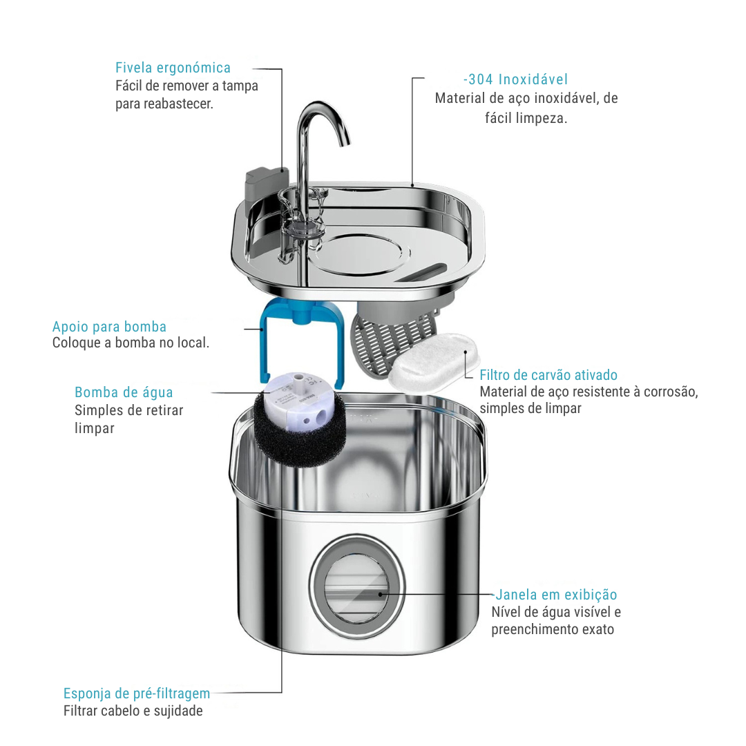 Feito com tigela de aço inoxidável de grau alimentício, é altamente durável, resistente à ferrugem e fácil de limpar. Esse material também inibe a proliferação de bactérias, tornando a água mais segura para seu pet.