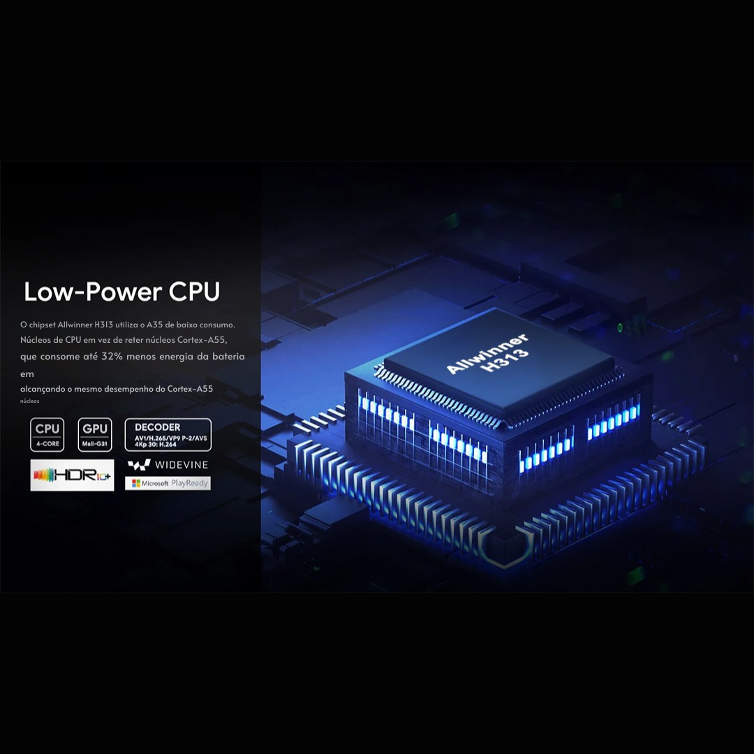 Com o sistema operacional mais recente, o SmartBox T1 garante uma navegação fluida e compatibilidade com os principais apps da Google Play Store , como Netflix, YouTube, Spotify, Disney+, HBO Max e muito mais.Desempenho Ágil com Processador Allwinner H313: