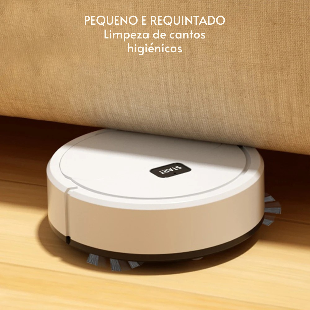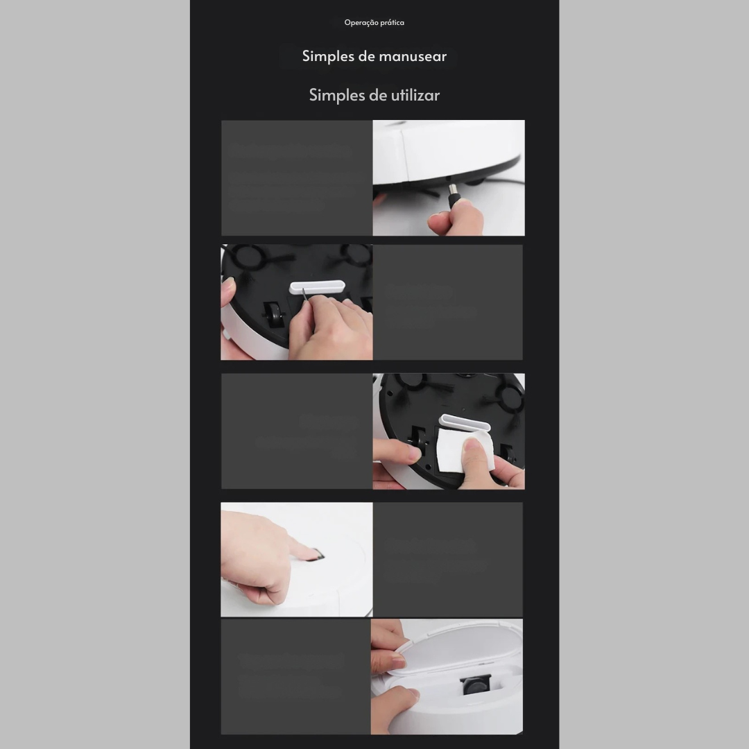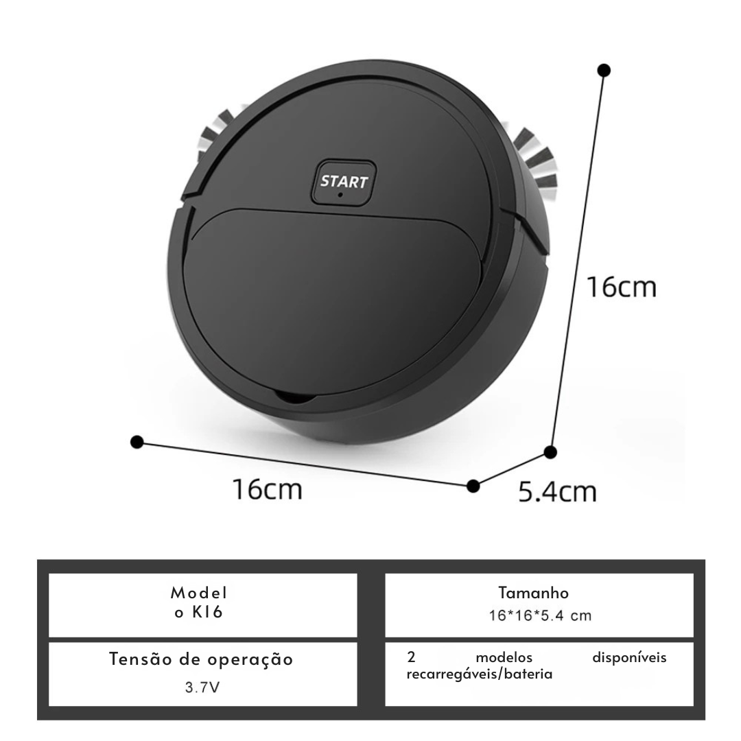Com apenas 16 cm de diâmetro e 5,4 cm de altura, o corpo mini do robô permite que ele entre facilmente embaixo de sofás, camas, armários e em cantos difíceis, garantindo uma limpeza completa até nos menores espaços.