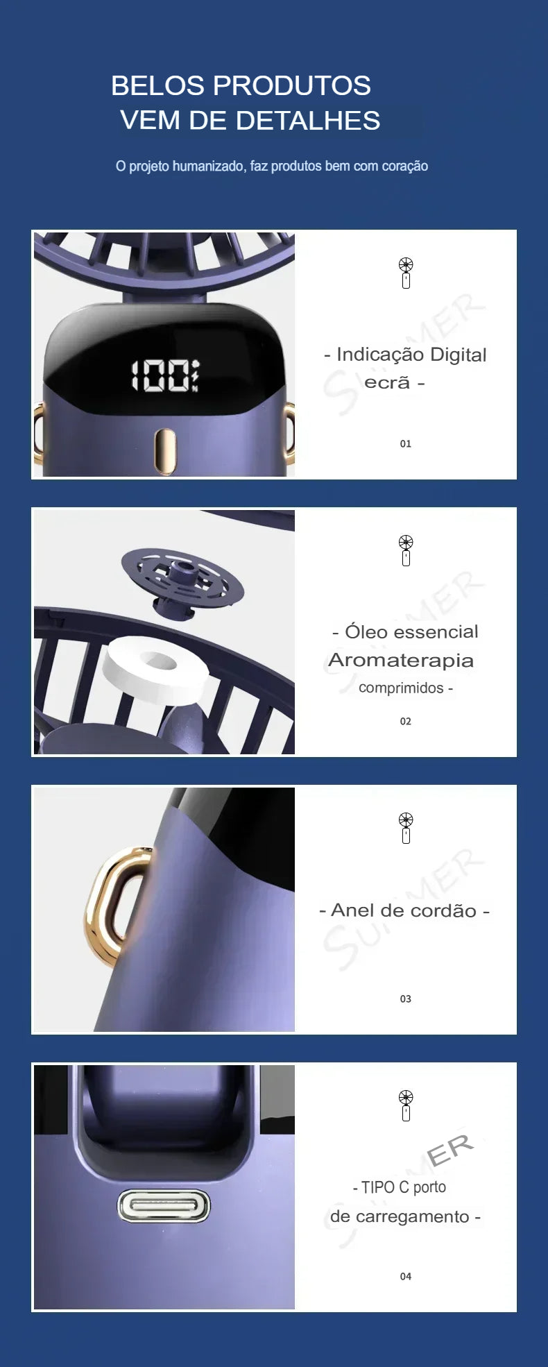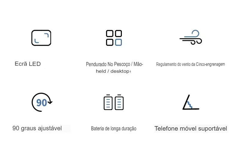 Utilize como ventilador de mão, de mesa (base estável) ou pendurado no pescoço, garantindo liberdade de movimento.